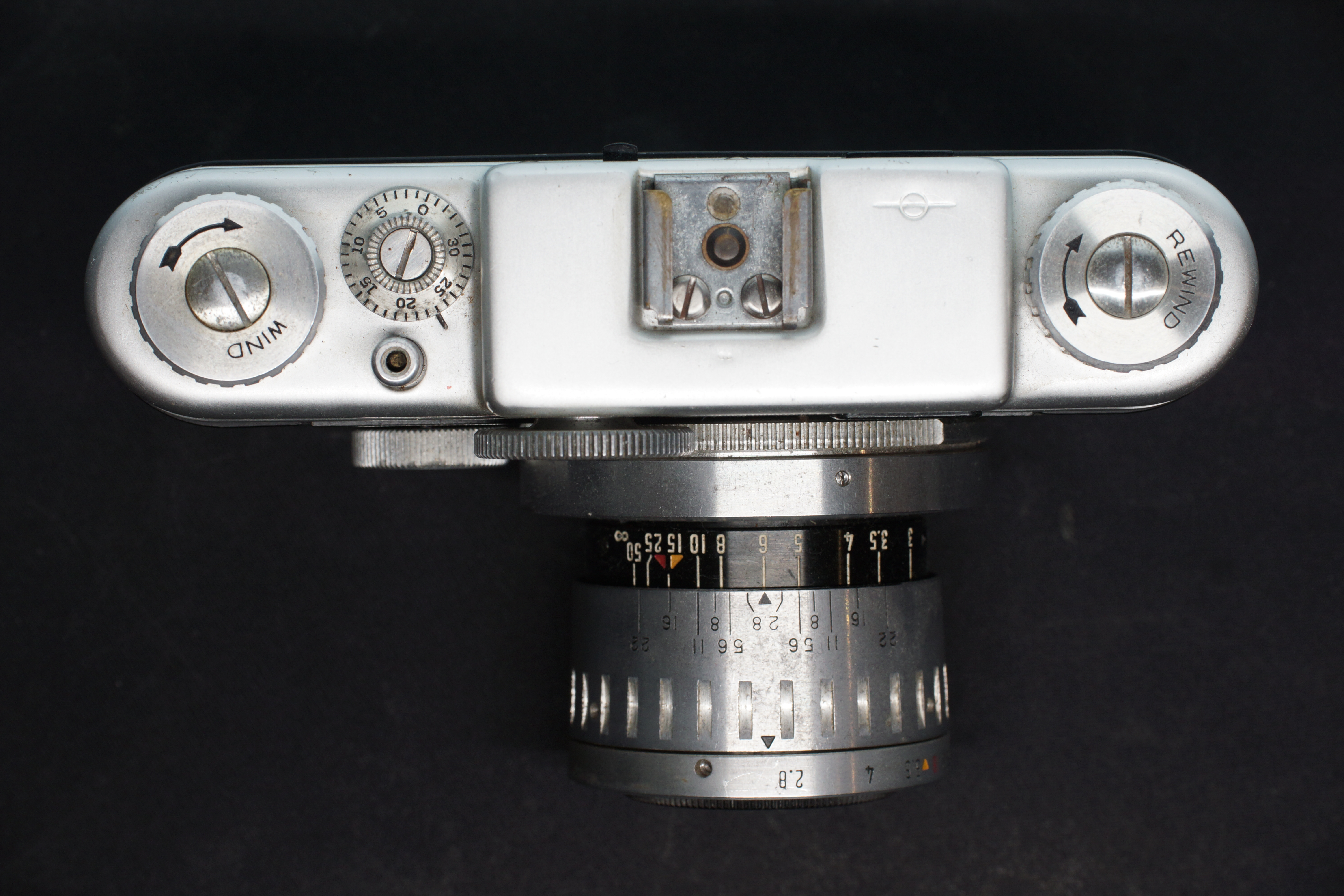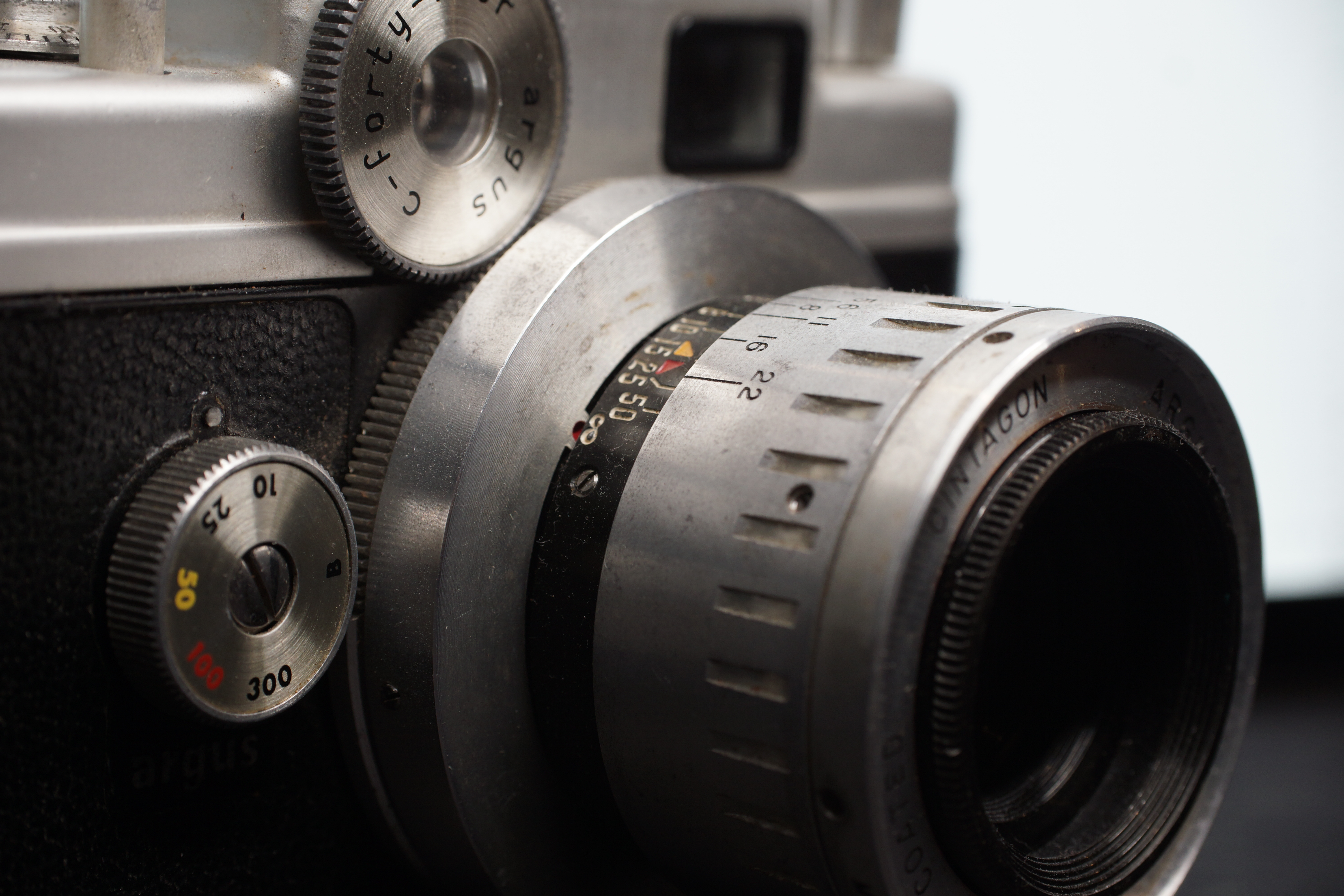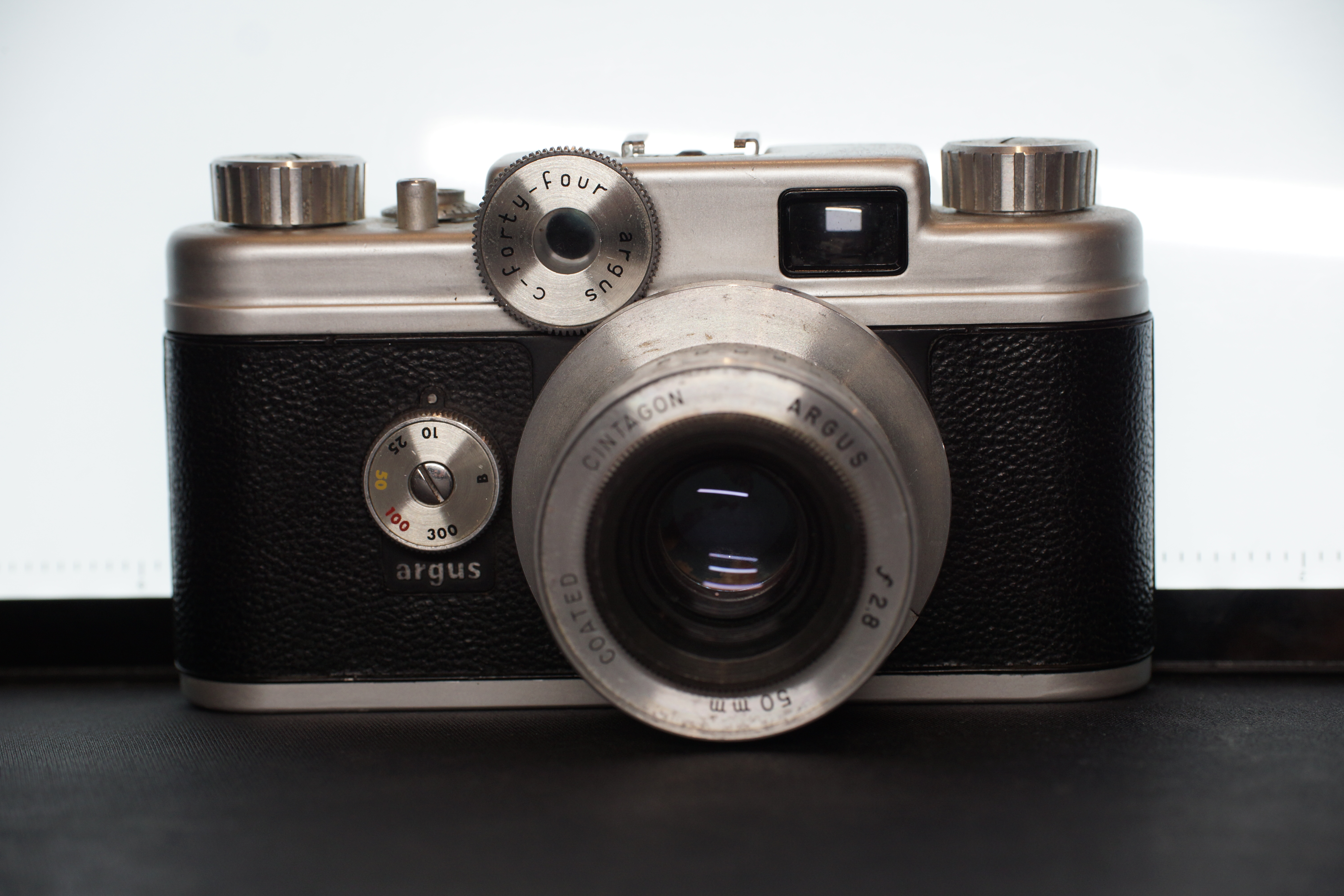 Caption The Argus C-44 in all its glory. You change shutter speeds with the dial on the front of the body and, allegedly, focus by rotating that silver dial just above the lens. The dial also houses the rangefinder window which is neat. Mine is equipped with a stock 50mm f2.8 lens.