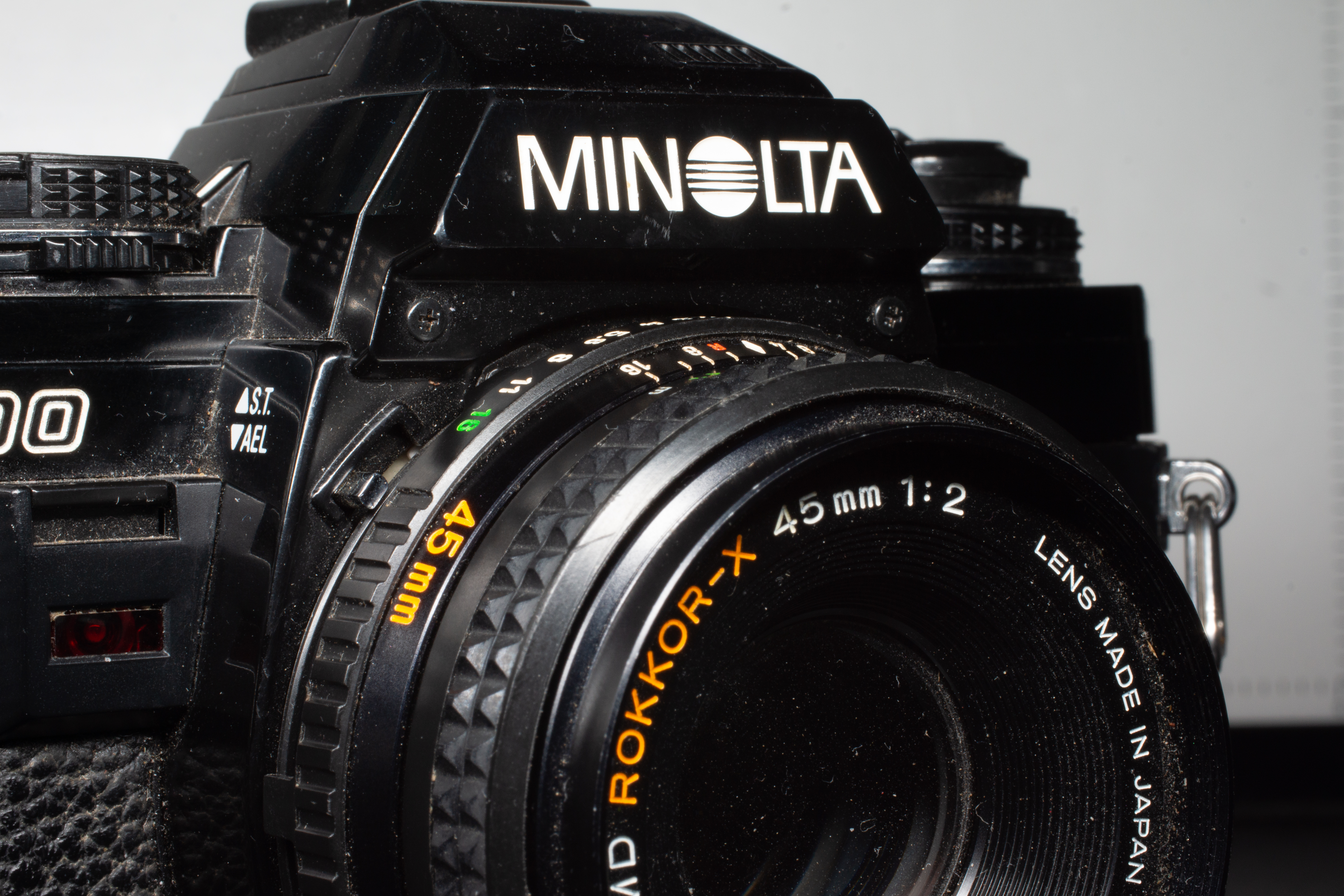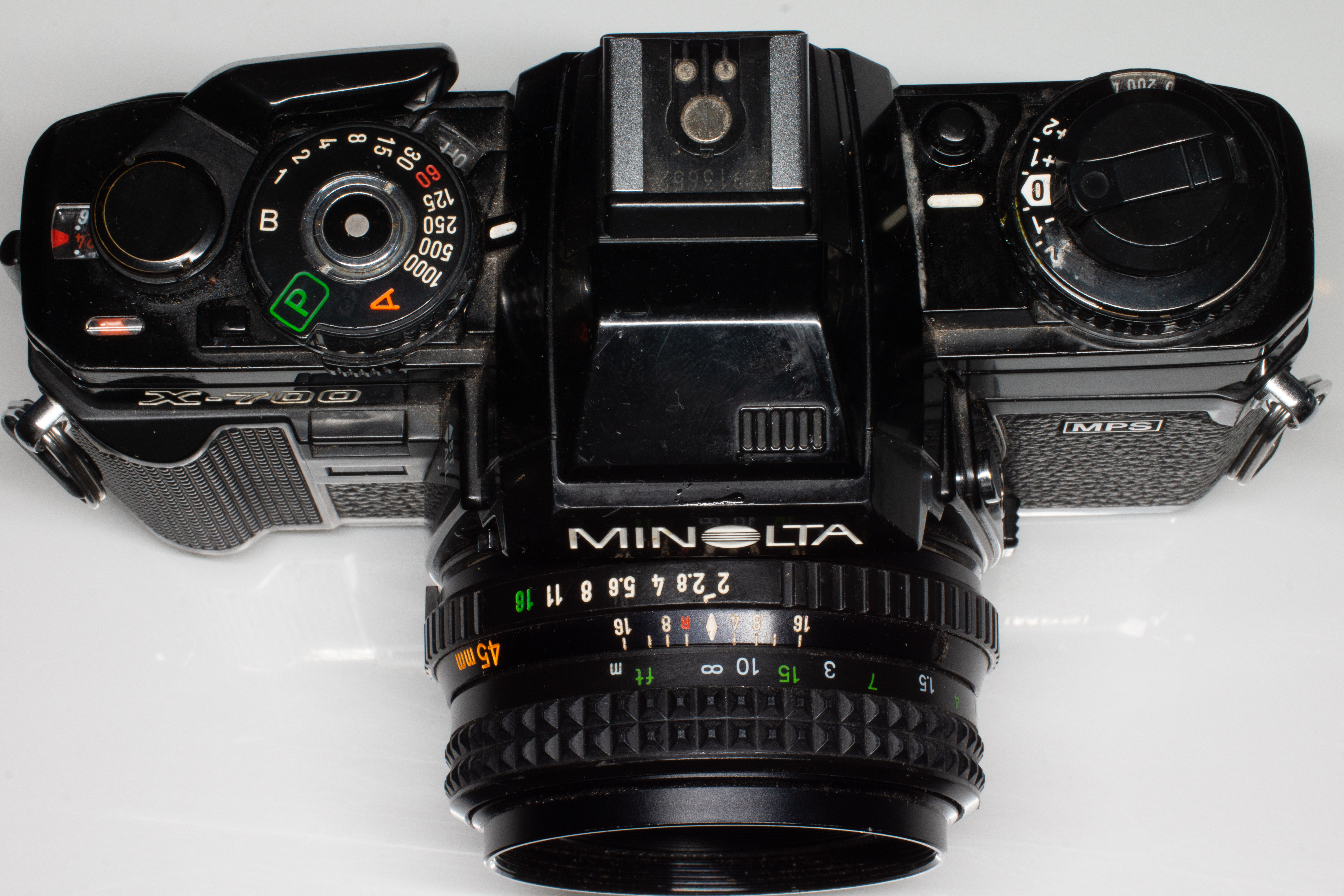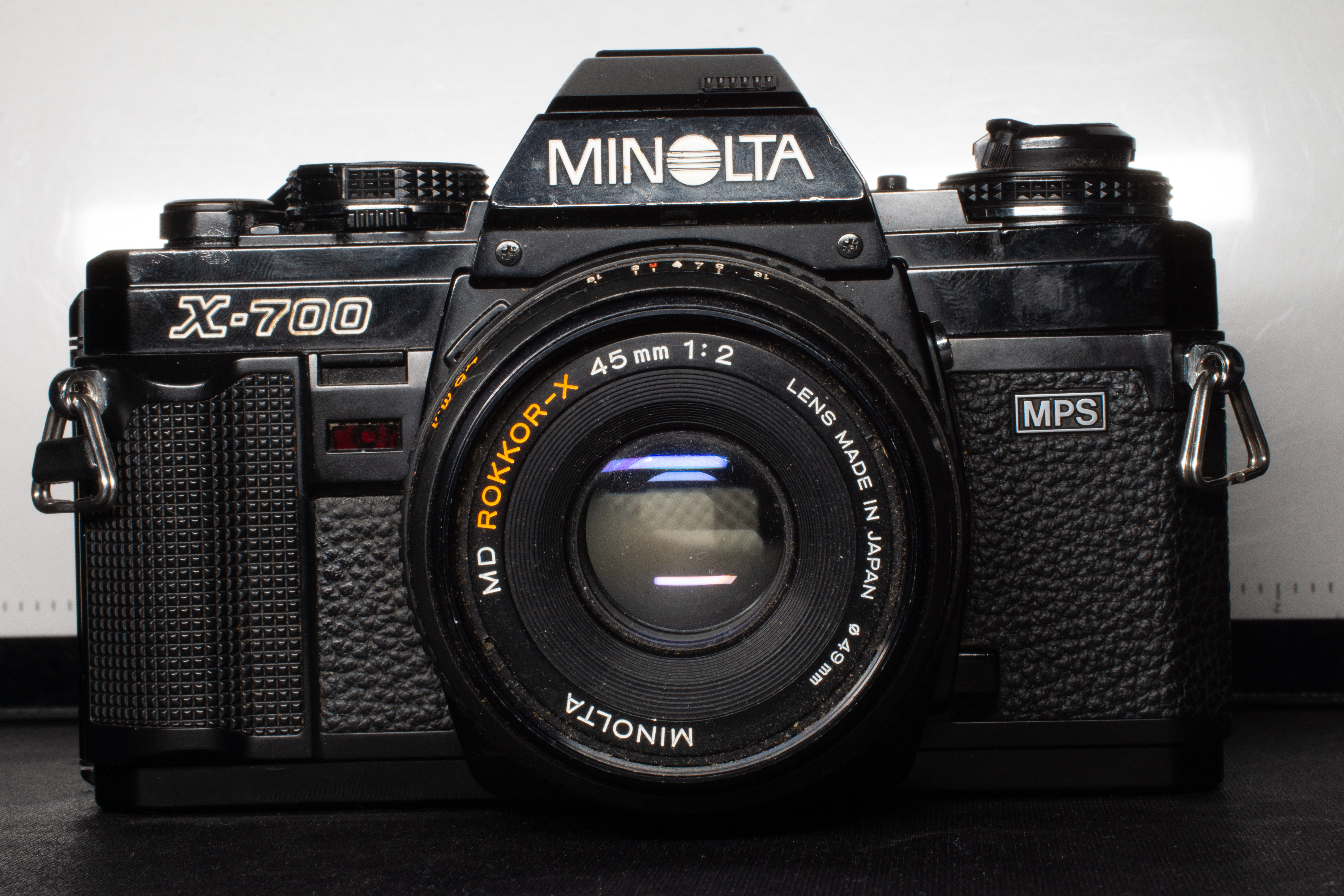 Caption My Minolta X-700 which I’ve since loaned/gifted to Joy. Here it’s equipped with the 45mm f2 lens that I used for the majority of the time. The build quality on this camera is superb, and it’s crammed with features for its time, but it is a bit bulky.