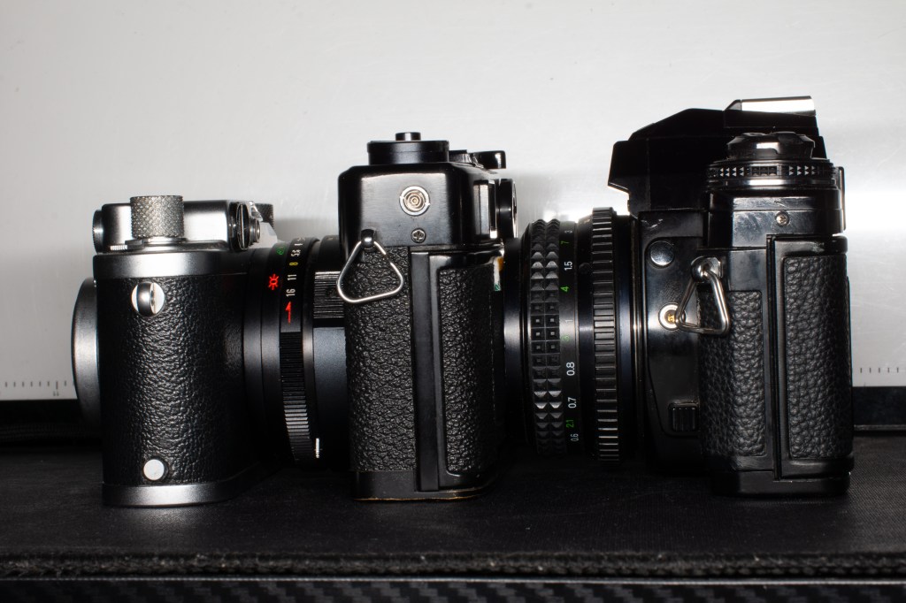Caption Size comparison between the Leica iif, Yashica Electro 35cc, and Minolta X-700 (from left to right). The difference is stark. The Leica is by far the smallest camera with the Elmar 50mm lens equipped, fitting easily in your pant’s pocket. Pocketing the Yashica is possible with a jacket while the Minolta has no hope of fitting in any but the largest of jacket pockets.