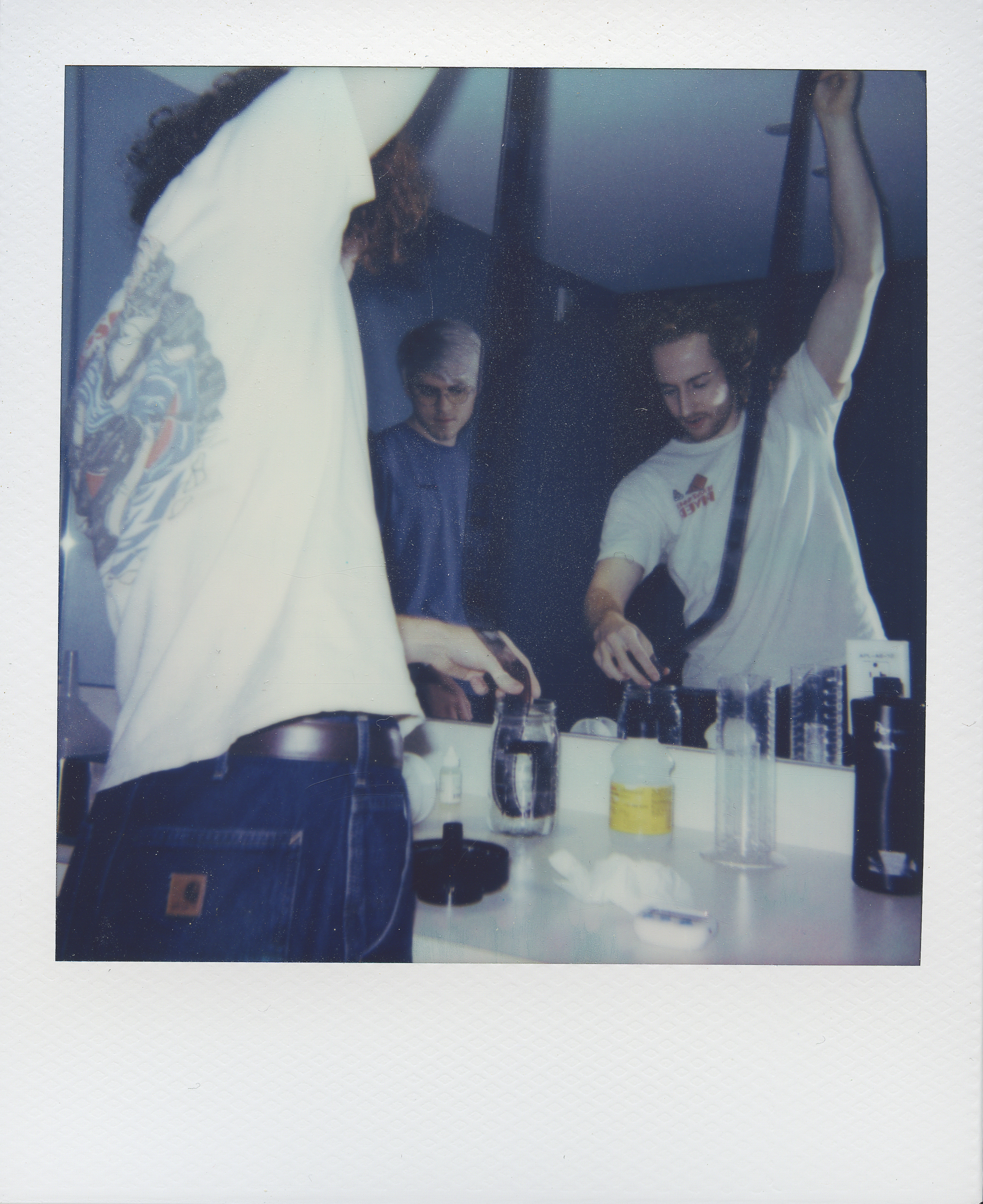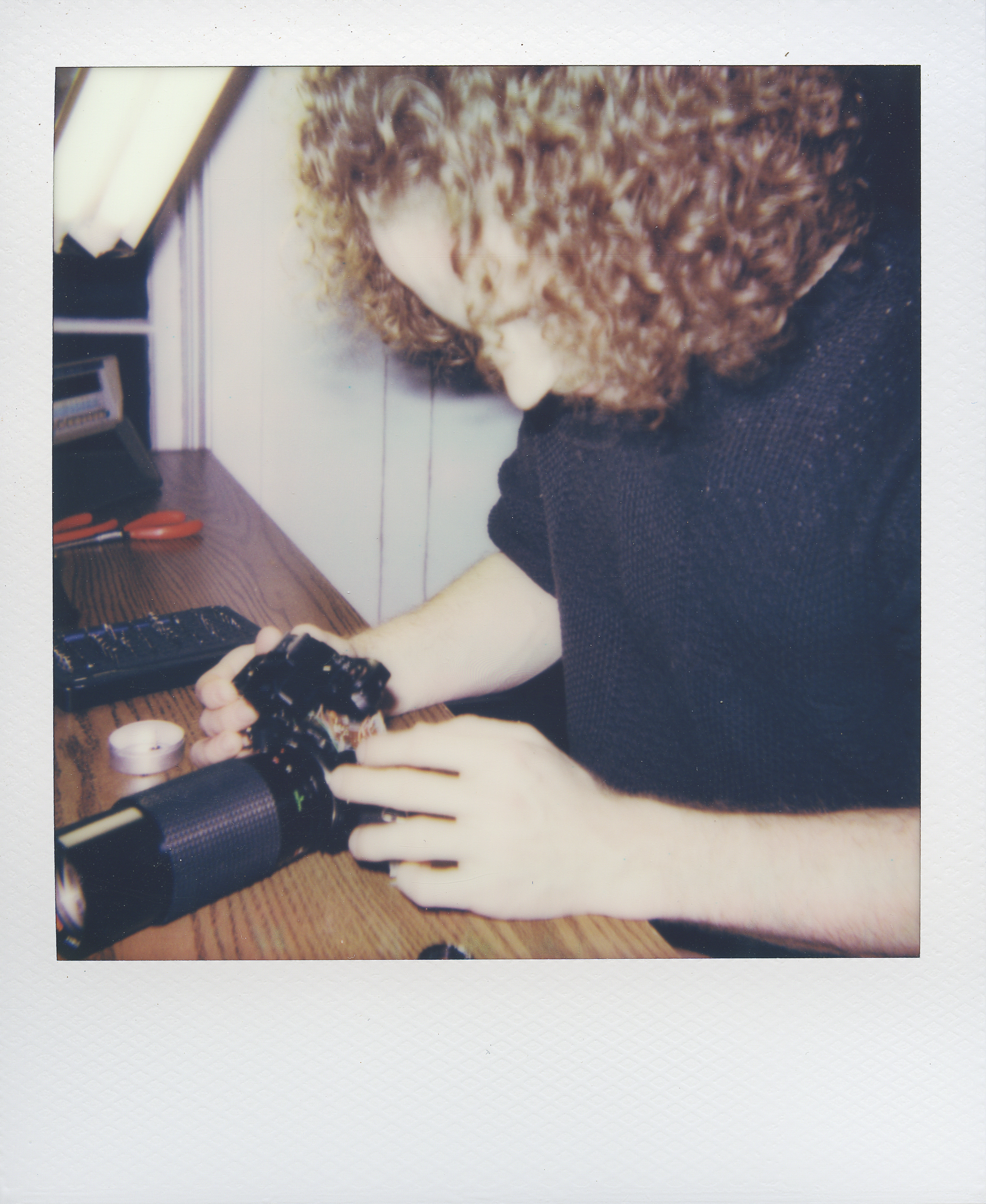 Caption (Left) Either reassembling or disassembling the Minolta X-700 in Jack’s apartment. (Right) Learning to develop black and white film with Jack (not pictured) and Levi. Photos taken on Polaroid by Jack.