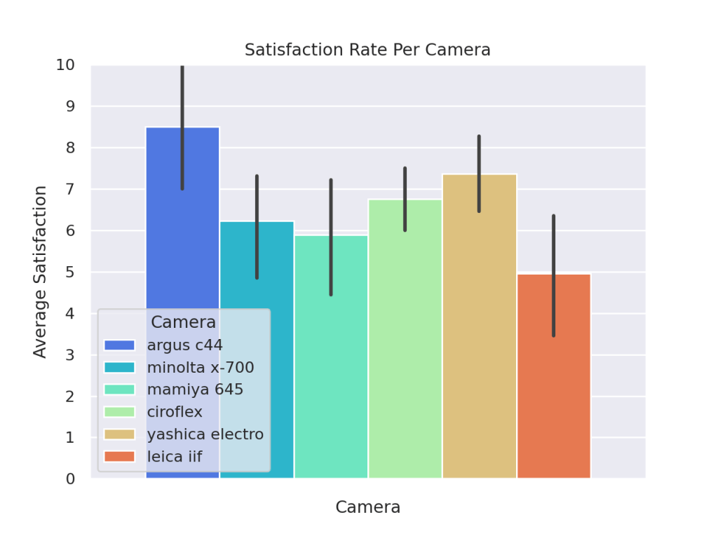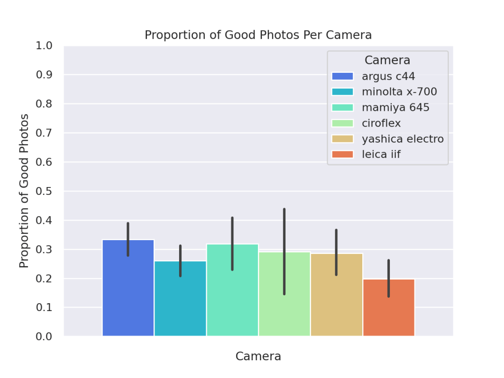We can see this pretty clearly in the above plots, where the Leica has the lowest satisfaction rate and proportion of good photos out of any of my cameras. This is a result of many failed or nearly failed rolls that came out of that camera as I sorted out its mechanical issues. The surprise winner here is the Argus, with an average satisfaction rate of 8.5/10, though this is a direct result of its low sample size of 2 rolls.