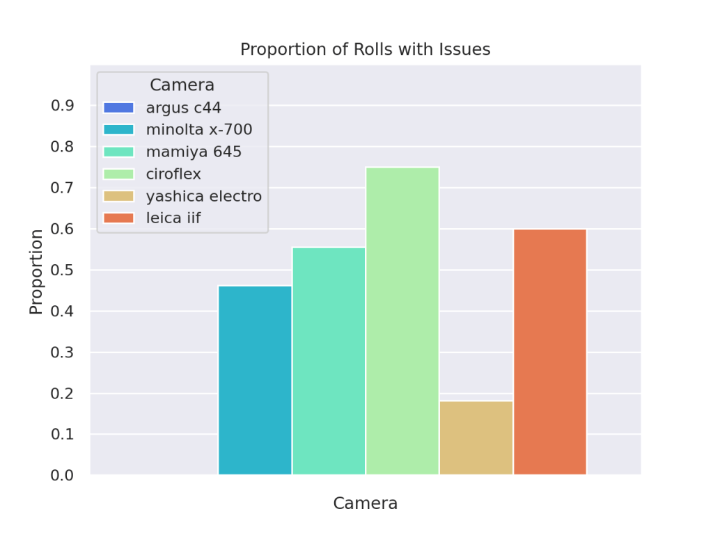 We see some similar story lines as well in the above plot. Here I’m showing the proportion of developed rolls I got back, per camera, that had mechanical or development issues. Surprisingly the majority of rolls I got back had some kind of issue apparently. Notably the Ciroflex has the highest rate of mechanical issues since nearly every roll that comes back out of that camera has vertical scratches running down the film. Also the Leica, as I mentioned before, had plenty of issues with the shutter which show up in this plot as well. Of course the Yashica had basically no mechanical issues, but it still had some rolls marked as having development problems. Lastly the Argus doesn’t even show face on this plot since both of the two rolls I shot through it came back perfectly clean.
