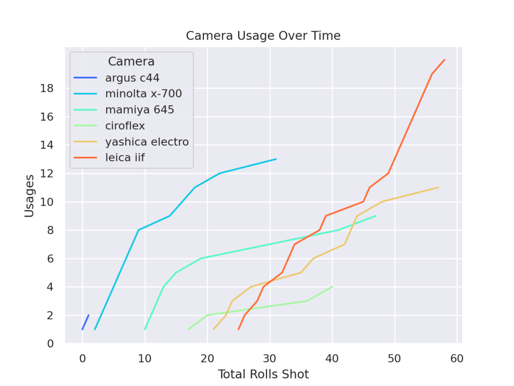With this data I’m also able to visualize how many rolls I shot through each camera, telling a nice story of when each camera came into my life and how much I enjoyed shooting them.