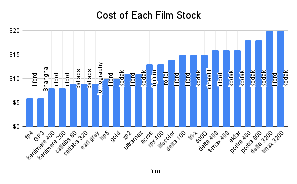 Caption: Chart plotting the price I assigned to each film stock. There are definitely some super inflated prices here, but that’s just because I was a fool and over paid. Also this is the only plot I made in google sheets which is why it’s so ugly.