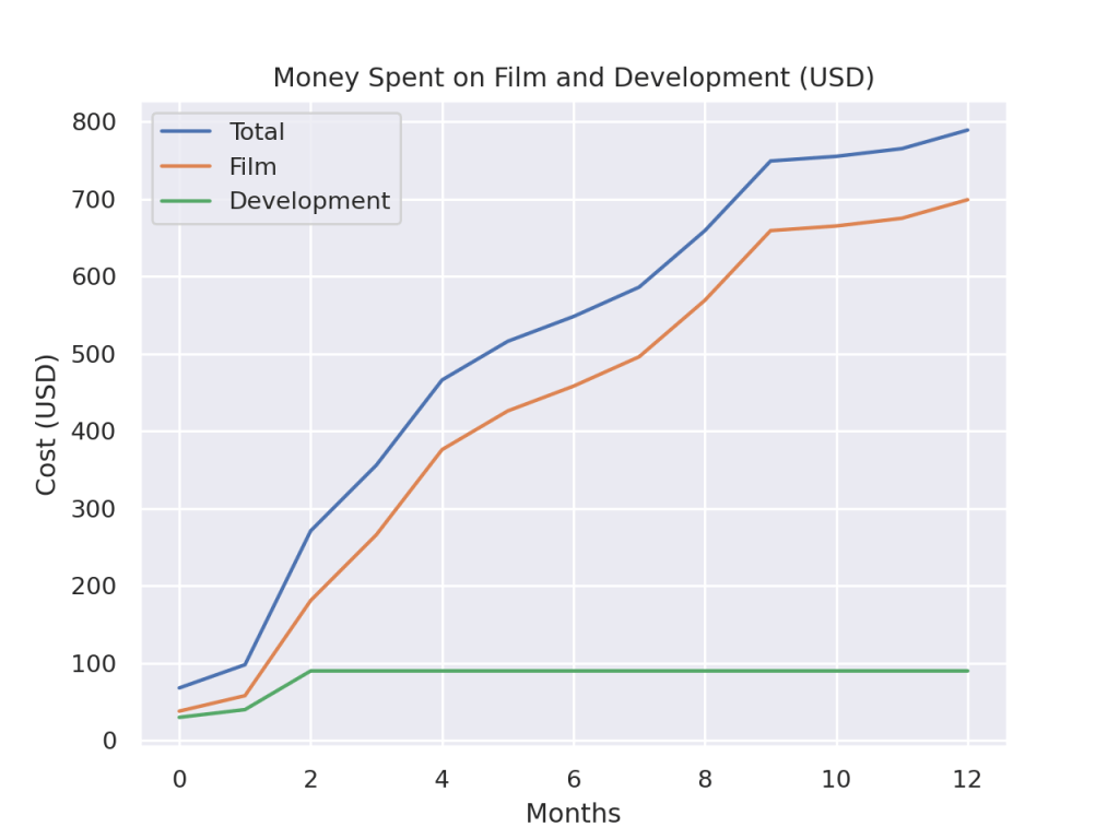Caption: Plotting how much I spent on film and development over the last year. Here “Months” on the x-axis represents months since October 2024.