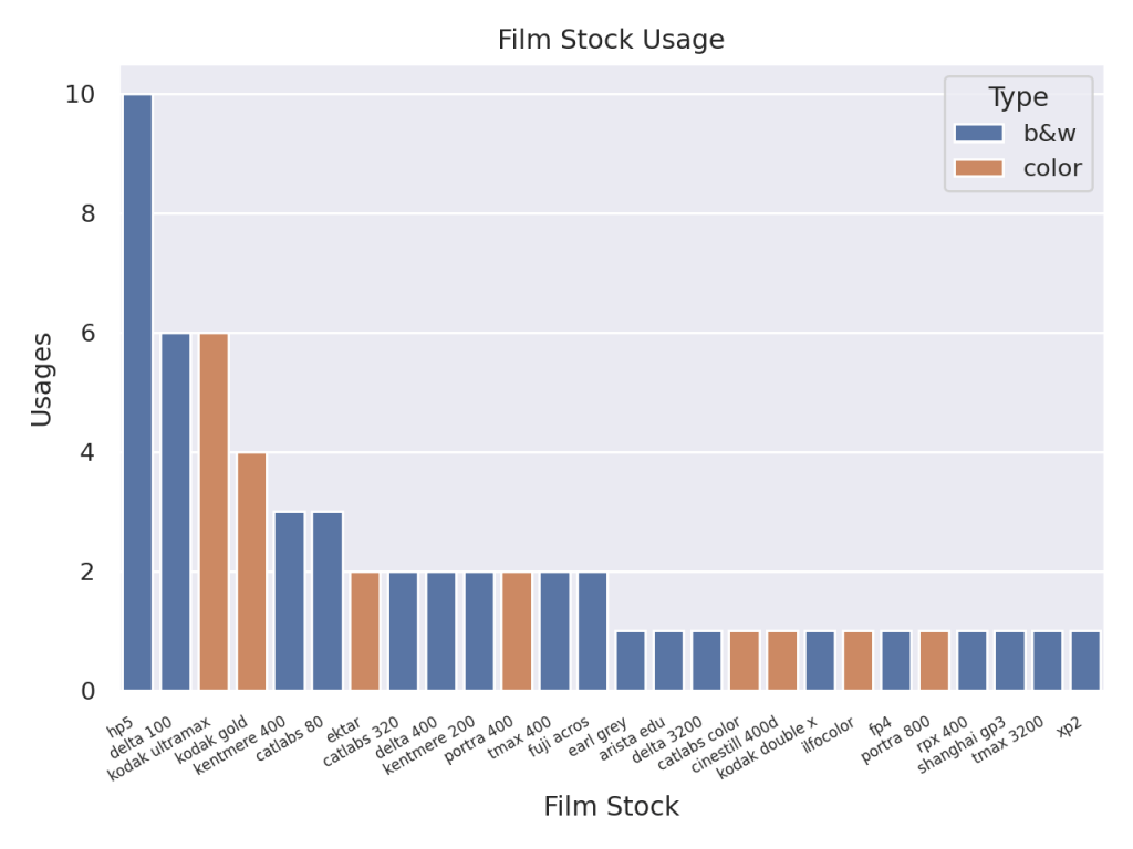 Next we’ll compare my usage of each film stock over time. Early on I was shooting primarily color film, with the mentality “what’s the point of black and white when we have color”, but that mentality has clearly changed as the plot shows. Around roll 11 I ceased shooting color film for a number of months and began shooting nearly exclusively black and white. This is also reflected in the bar plot on the right, where I experimented with far more B&W film stocks, and used Ilford’s HP5 and Delta 100 the most by far. Kodak Ultramax also saw a lot of usage, but the main reason there is that I was gifted a large amount of it for Christmas.