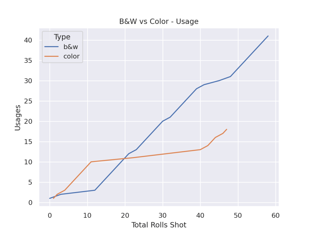In addition to just showing how much money I spent, I think the plot above also tells a bit of a story about my excitement over time. The shape of the “Total” curve isn’t quite linear, instead starting with a quick rise and gradually flattening between months 4 and 7. If we were to continue this trend from month 7 we can imagine a log(x) or sqrt(x) type shape beginning to form. Months 7-9 were around the time I went on conference travel to ICML in Vancouver and visited my Uncle David in California, so a bit more film was shot around this time, resulting in the sharp increase. After that period I was pretty burnt out, having traveled to two conferences, ICML and RLC, back-to-back and finishing up a paper submission to ICLR so we see that very few rolls were shot between months 9-12.